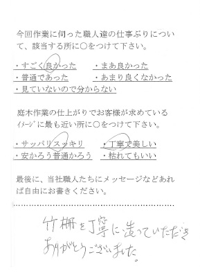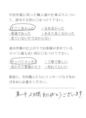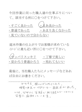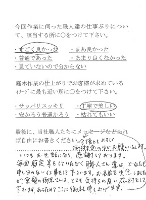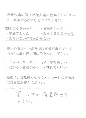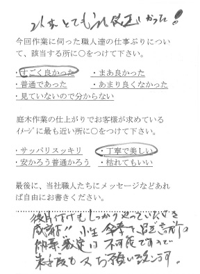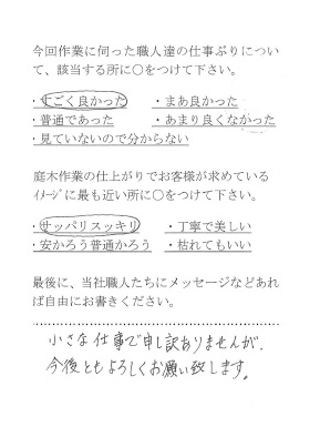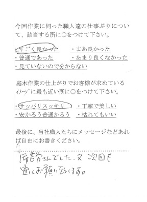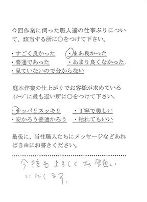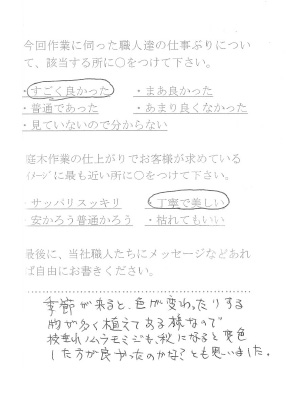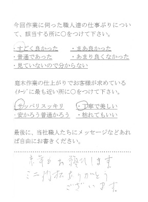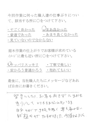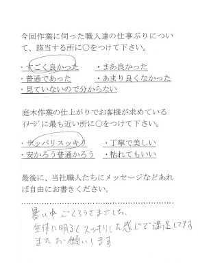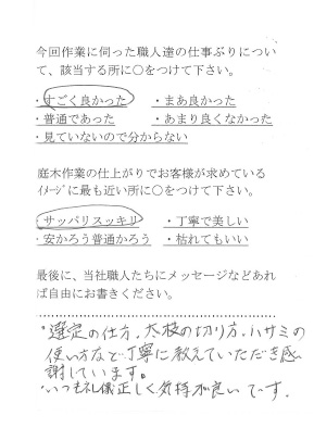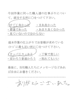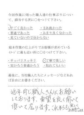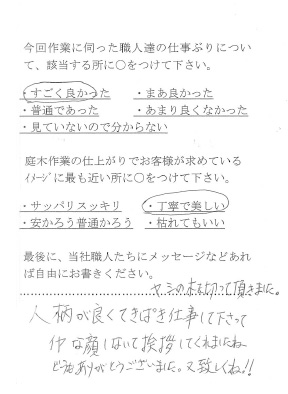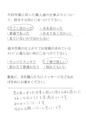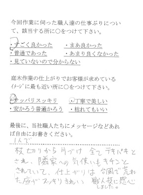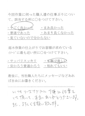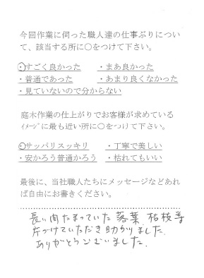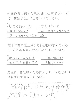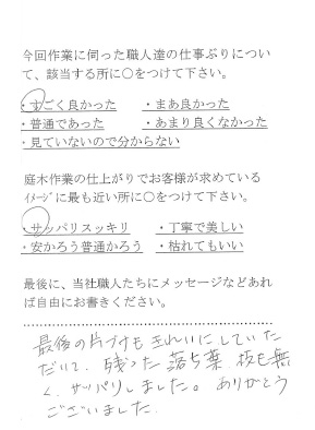 最後の片づけもきれいにしていただいて、残った落ち葉・枝も無くサッパリしました。ありがとうございました。