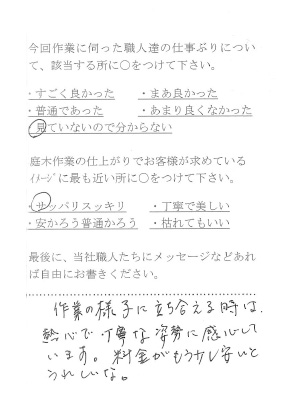 作業の様子に立ち合える時は、熱心で丁寧な姿勢に感心しています。料金がもう少し安いとうれしいな。