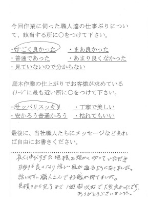 1人で枝切りから片づけ全てテキパキとされ、隣家への気づかいもキチンとされていて、仕上がりは台風で荒れた庭がスッキリきれい。職人技に感心しました。